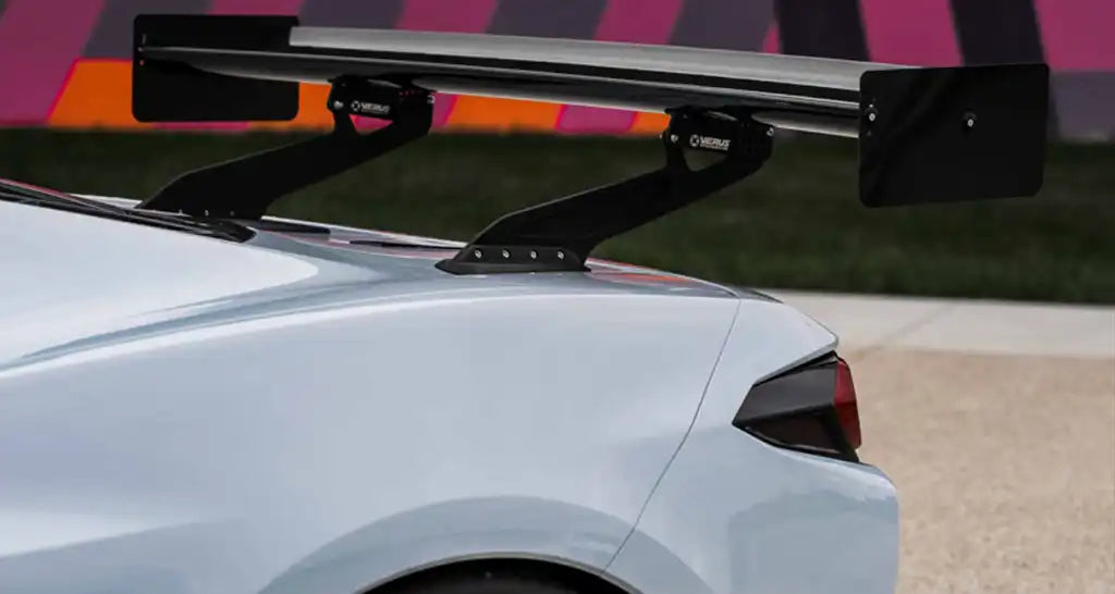 Utilizando software de análisis de última generación durante el proceso de I+D, Verus pudo extraer más rendimiento para el volumen de construcción determinado; aumento de la carga aerodinámica generada y mínimo aumento de la resistencia al añadir el alerón trasero al chasis del C8. Esta es una de las únicas alas disponibles para el C8 que tiene un ángulo de ataque ajustable de 0 a 15 grados. Tener este ajuste ayuda a configurar la carga aerodinámica trasera para cualquier pista o preferencia del conductor.