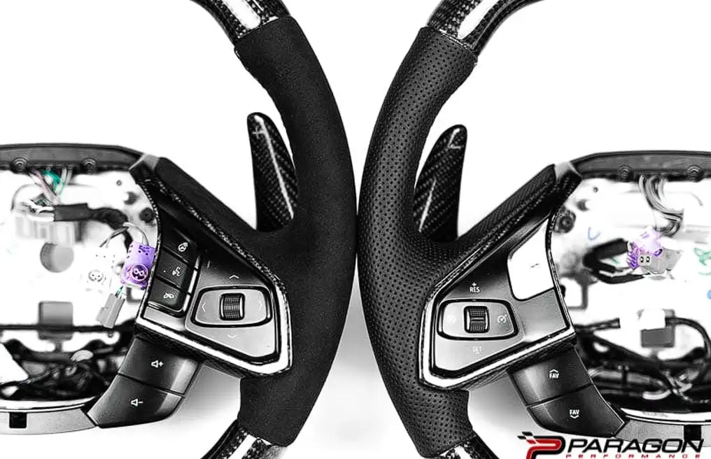 Replace your OEM Steering wheel with a carbon fiber version that is modeled after the C8 Z06. This is a direct OEM replacement. All you need to do is transfer your OEM buttons and switches.